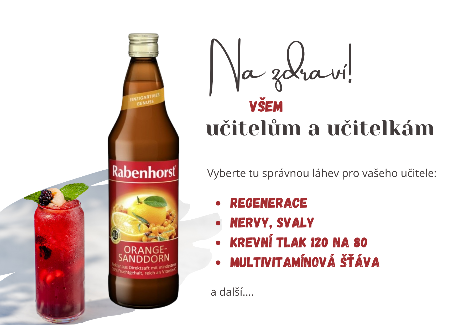 Pokud chcete závěrem roku poděkovat pedagogům za jejich práci, nemusíte chodit pro láhev pouze do vinotéky nebo pro potěšení do květinářství. Skvělým a zdravým dárkem, který udělá radost, může být i některá z přírodních šťáv Rabenhorst. Najdete u nás v nabídce široký výběr různých druhů, zacílení a výborné chuti. Například šťáva Uvolnění s...